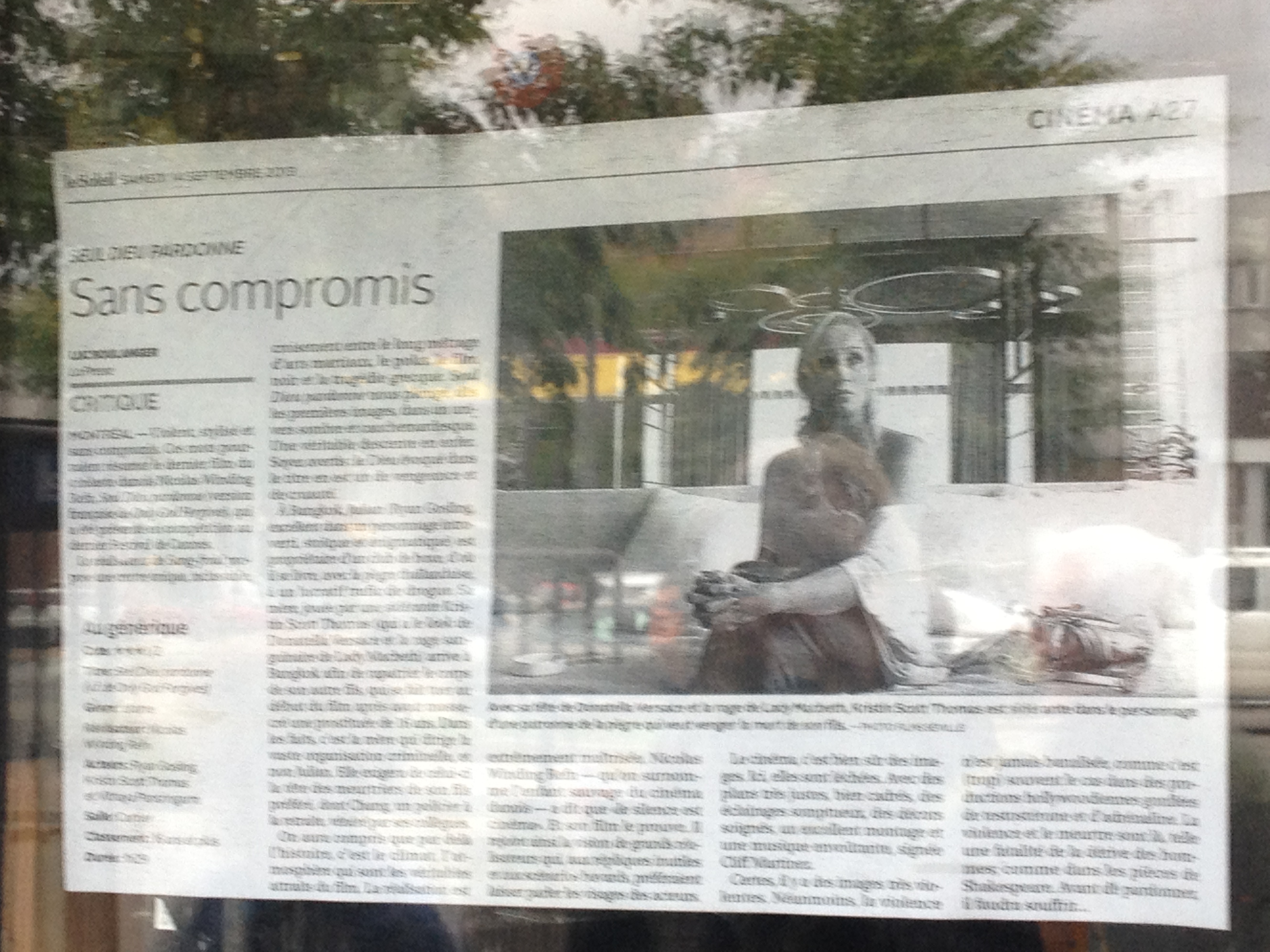 Avec mon amie Patricia Christie, conceptrice visuelle en cinéma, en visite à Québec ce week-end. Of course, on s’est retrouvées dans une salle de cinéma. C’était pas prévu, mais en passant devant le Cinéma Cartier, on a pas pu résister à une critique du film Only God Forgives (Seul Dieu pardonne) affichée dans la fenêtre montrant une photo de Kristin Scott Thomas (love her always) et Ryan Gosling (sexy always, always) réalisé par Nicolas Winding Refn (major brain crush). We were hooked! Je texte mon ami Michel Savoy, programmateur du Cinéma Cartier, sans hésiter il m’écrit que le film figure dans son top 25 meilleurs films à vie.